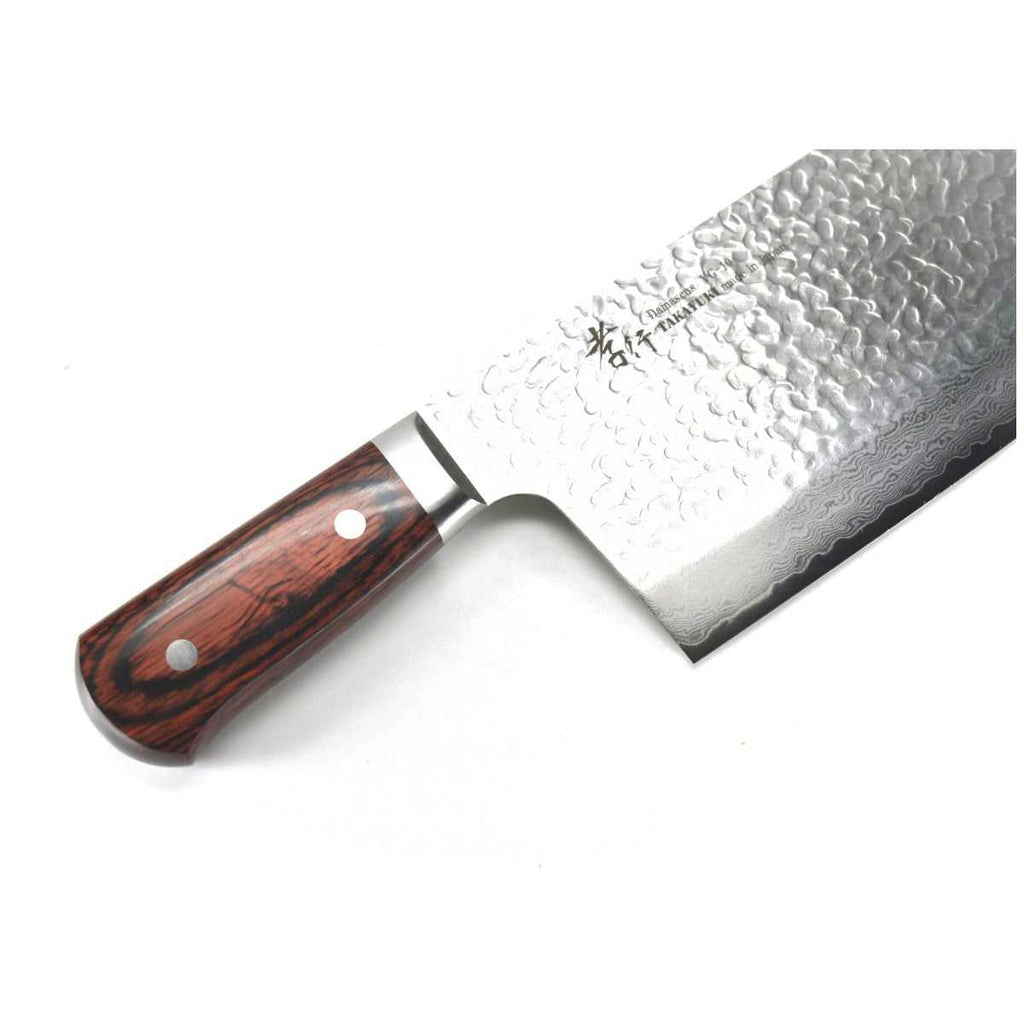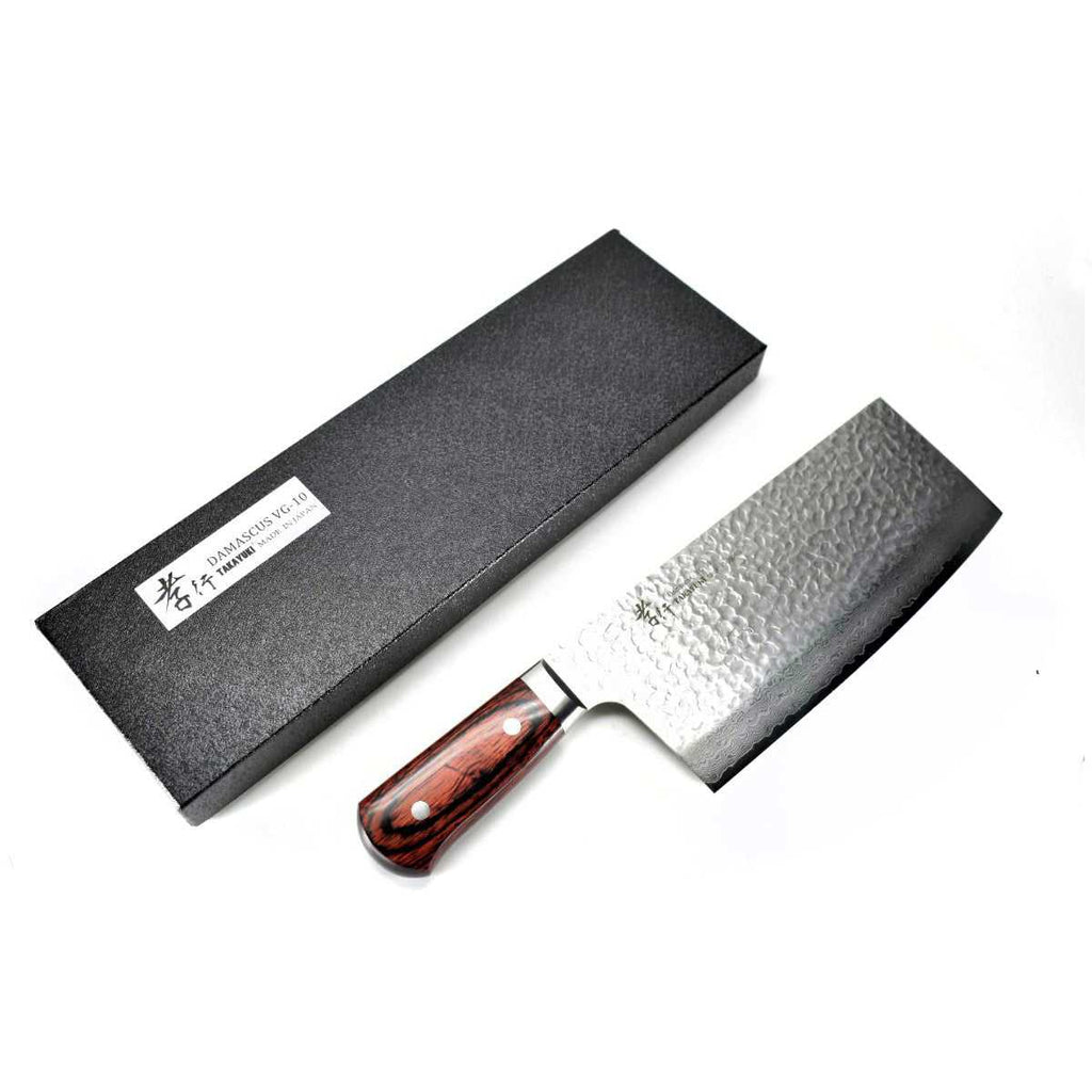 This is a Sakai Takayuki Cleaver 195 mm, made of VG-10 Stain Resistant Steel at the core of the blade, squeezed into 32 Layer Damascus Steel with Wooden Handle with Bolster. Beautiful Damascus pattern & Hammered Finish!!!