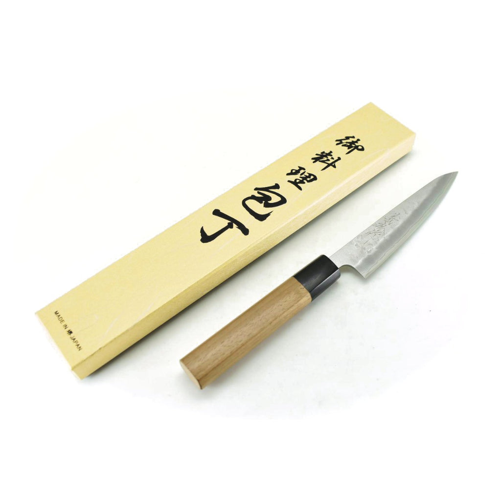 This is a Yoshihiro Paring Knife /Nashiji Finish, made of GINSAN(Yasuki Silver #3 Stainless Steel) at the core of the blade, squeezed into Stainless Steel(known as "Warikomi method"), with Octagonal Walnut Handle.