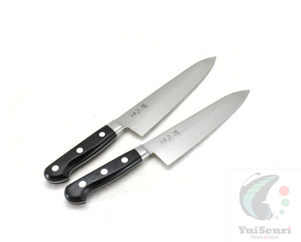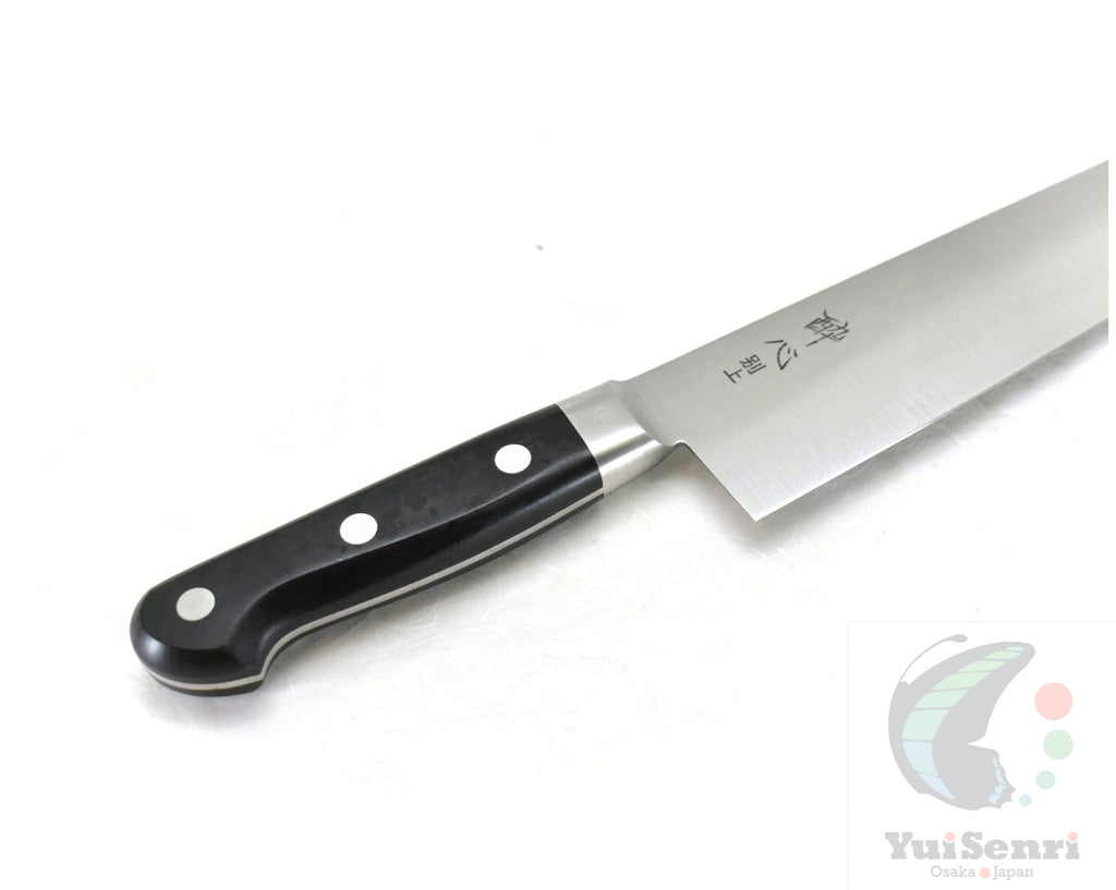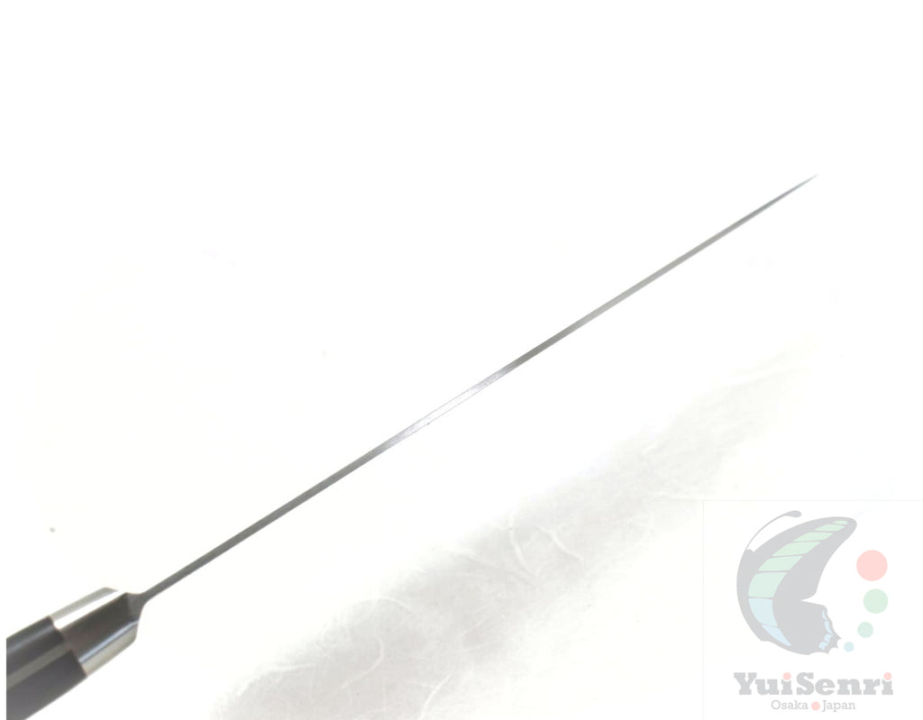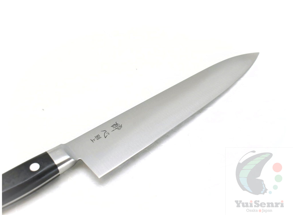 This is a Suisin Japan Steel Gyuto/Chef's Knife, made of High Carbon Japan Steel with Black Composite wood & Bolster by SUISIN. It has sharp edge with retension and easy to resharpen it, though HRC is app. 60.