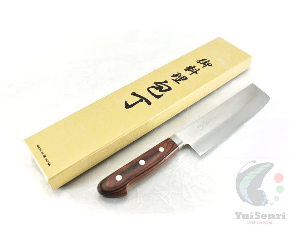 This is a Yoshihiro HGW Nakiri 160 mm, made of VG-1 Stain Resistant Steel at the core of the blade, squeezed into Stainless Steel(called "Warikomi" made by Awase method).