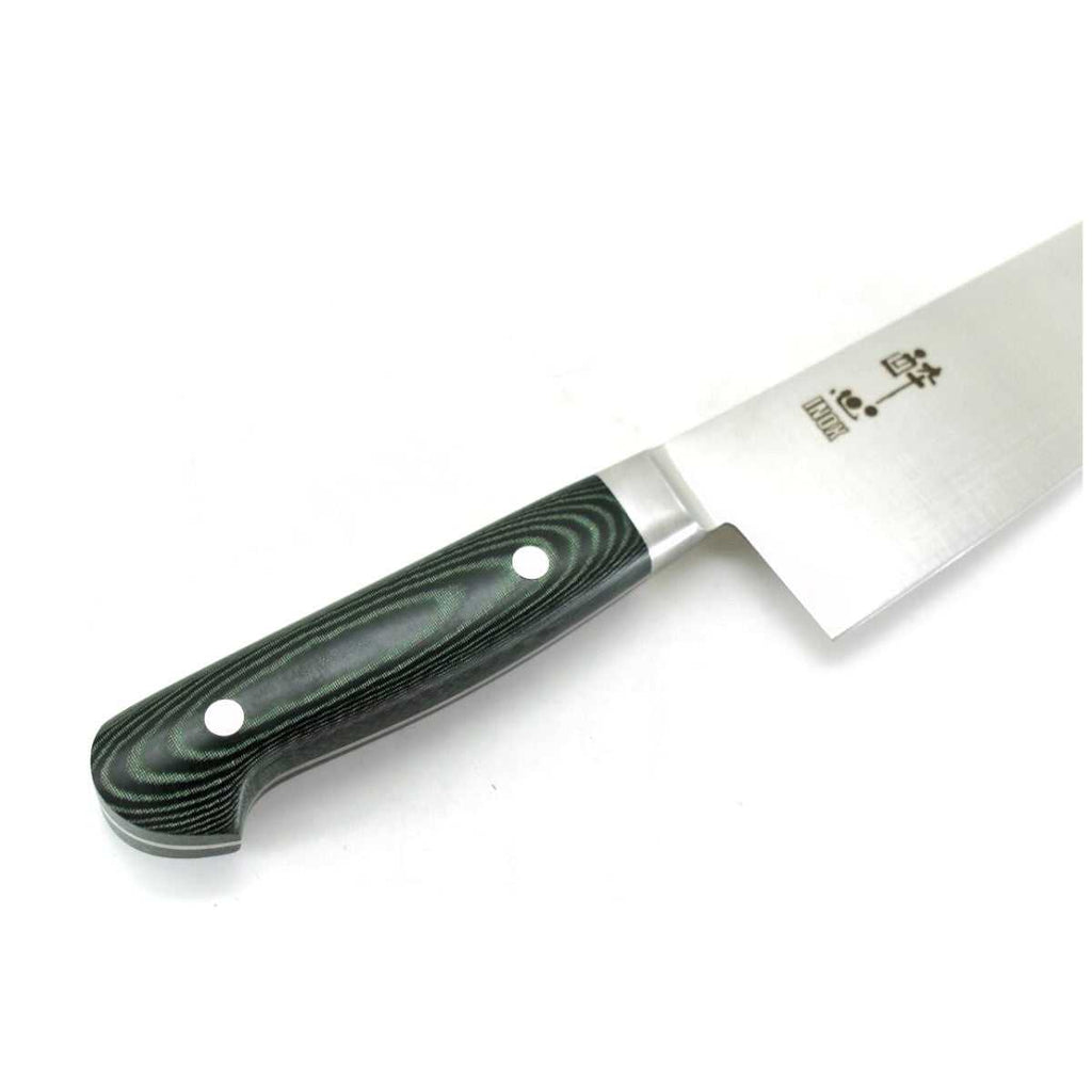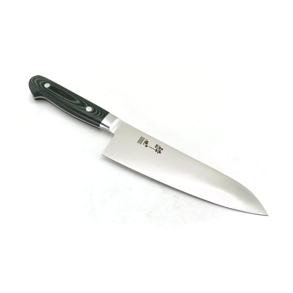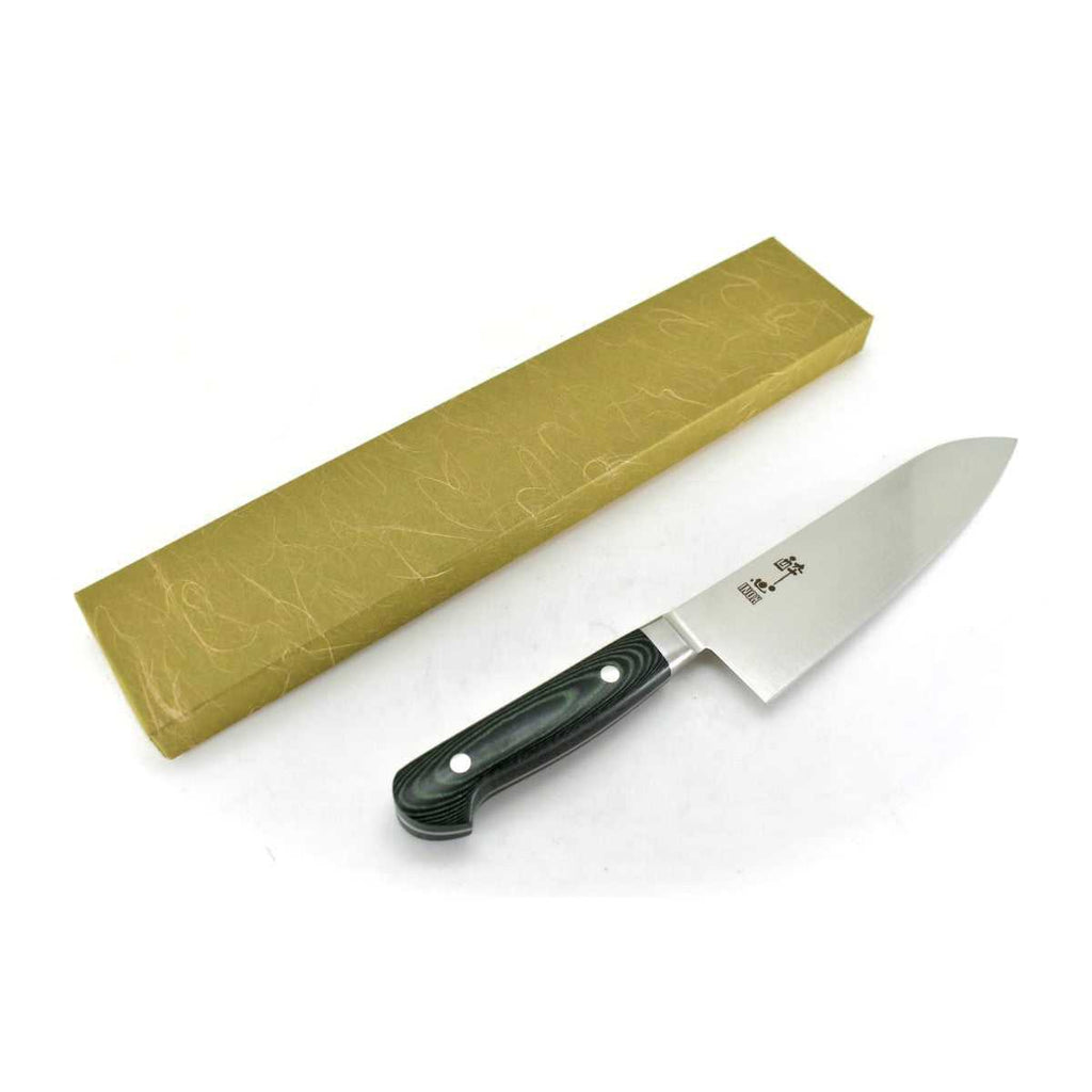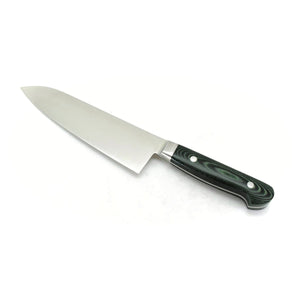This is a Suisin Premium INOX Santoku, made of Swedish INOX Stainless Steel with Colorful My Carta Handle & with Bolster by SUISIN. It has sharp edge with retension and easy to resharpen it, though HRC is app. 61.