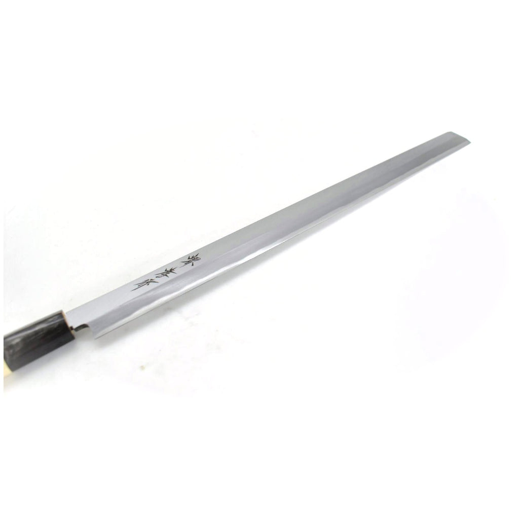 This is a Sakai Takayuki "KASUMITOGI" Professional Takohiki(Eastern Style Sashimi Knife), made of Yasuki White Steel(Shirogami) with Magnolia Wood Handle & Buffalo Horn Bolster.