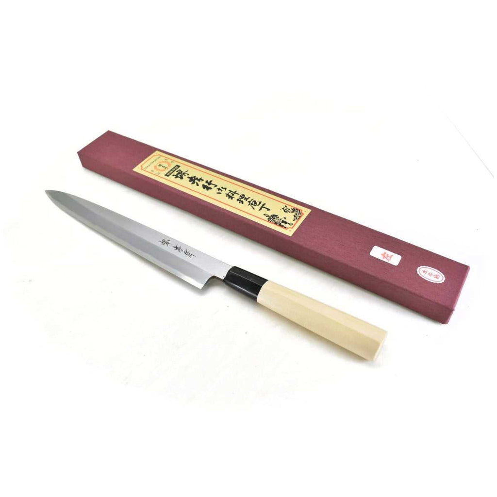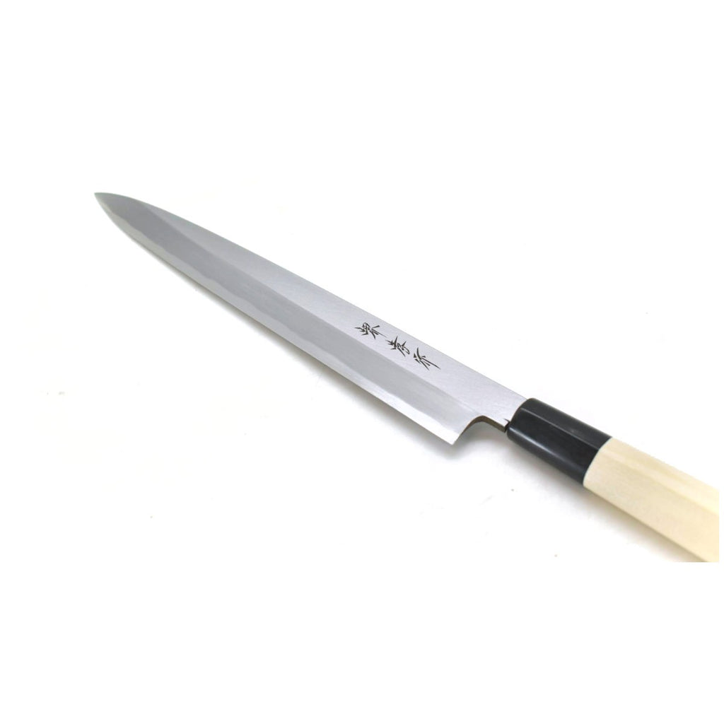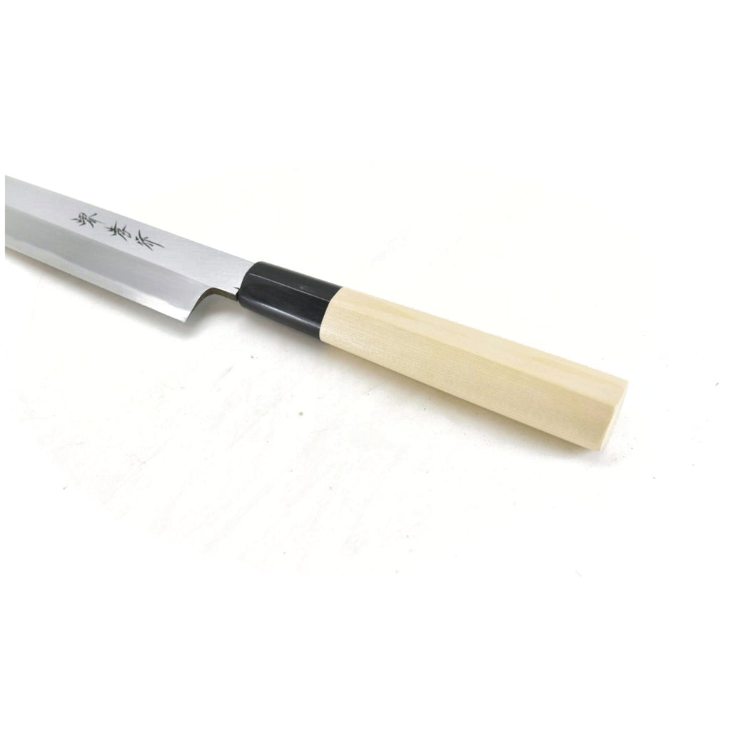 This is a Sakai Takayuki "Kasumitogi" Left Handed Professional Yanagiba, made of Yasuki White Steel(Shirogami) with Magnolia Wood Handle & Buffalo Horn Bolster.