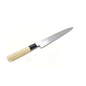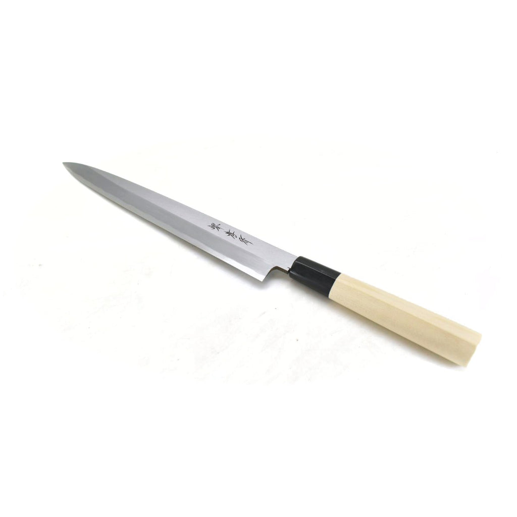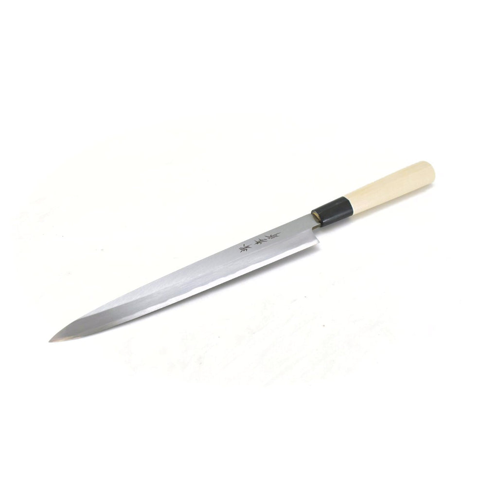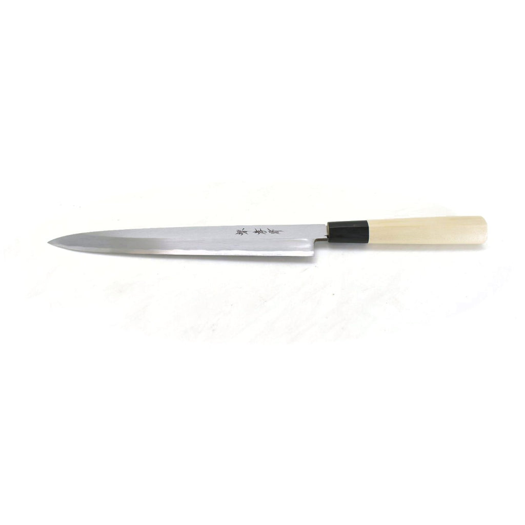 This is a Sakai Takayuki "Kasumitogi" Left Handed Professional Yanagiba, made of Yasuki White Steel(Shirogami) with Magnolia Wood Handle & Buffalo Horn Bolster.