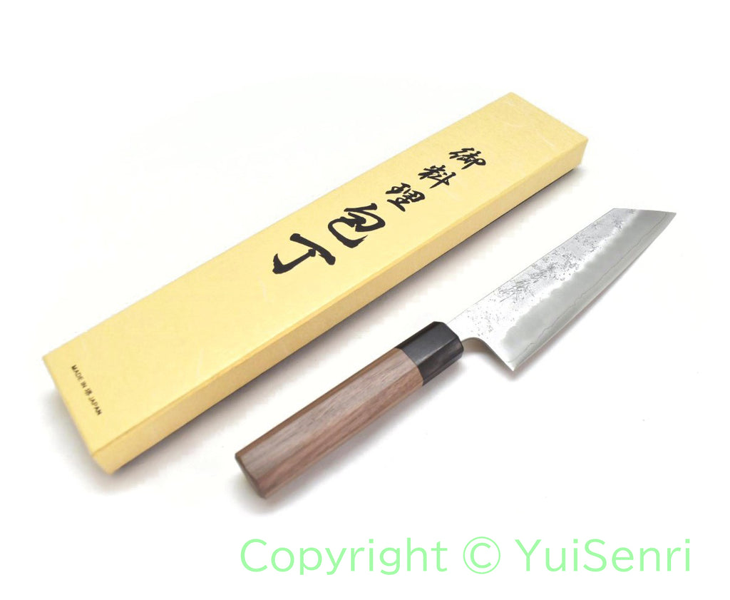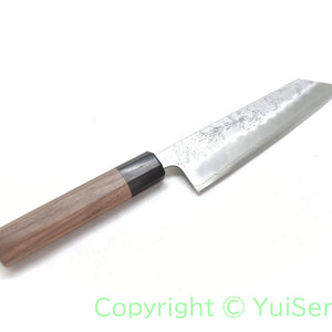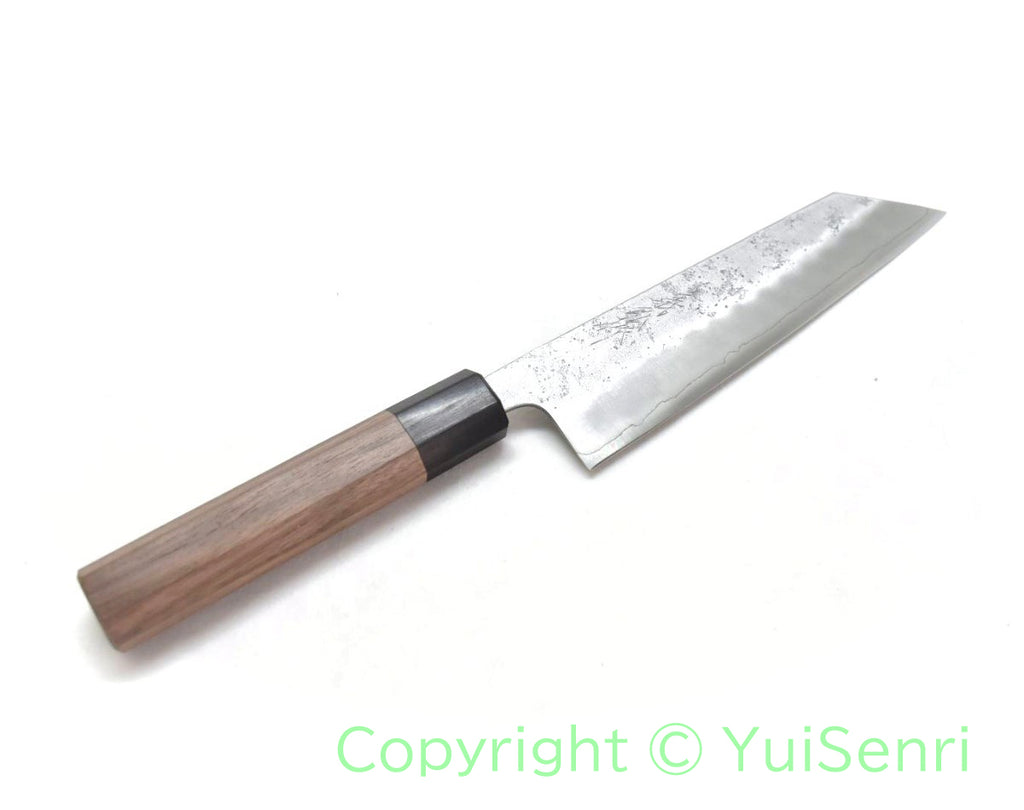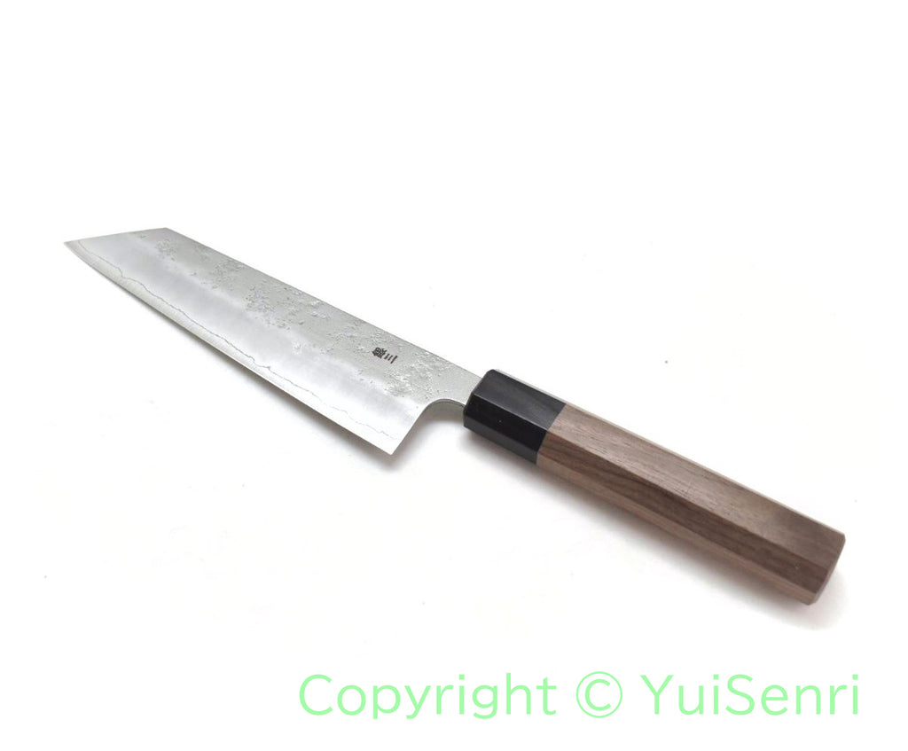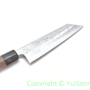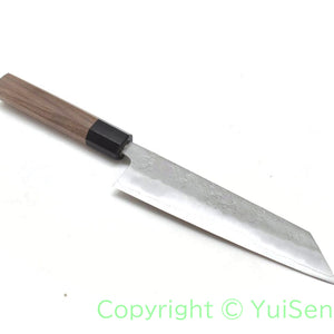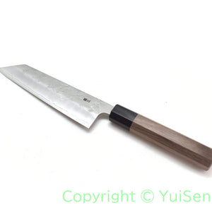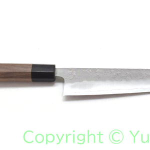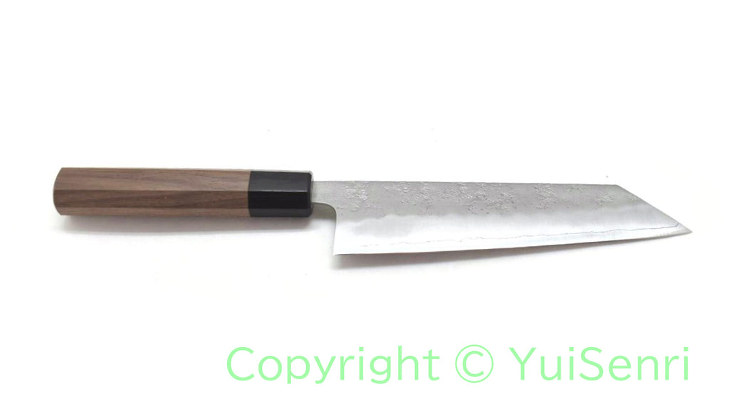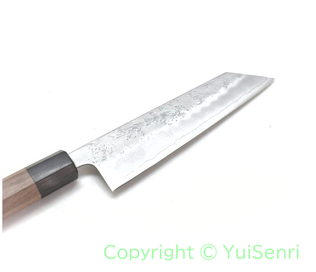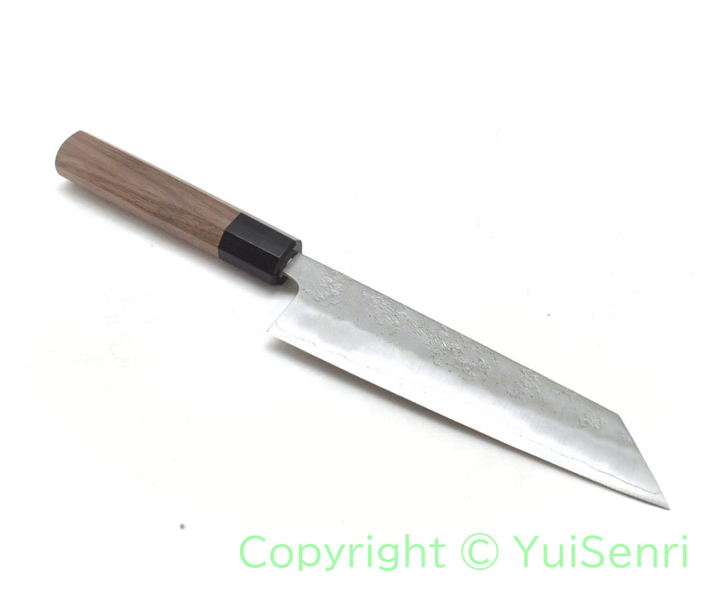 This is a Yoshihiro Bunka /Nashiji Finish, made of GINSAN(Yasuki Silver #3 Stainless Steel) at the core of the blade, squeezed into Stainless Steel(known as "Warikomi method"), with Octagonal Walnut Handle.