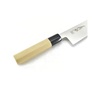 This is a Yoshihiro WGB Professional Santoku 180 mm, made of ALL VG-1 Stainless Steel with Professional Octagonal Handle(Octagonal Magnolia Handle & Buffalo Horn Bolster). Mono Steel Blade type.