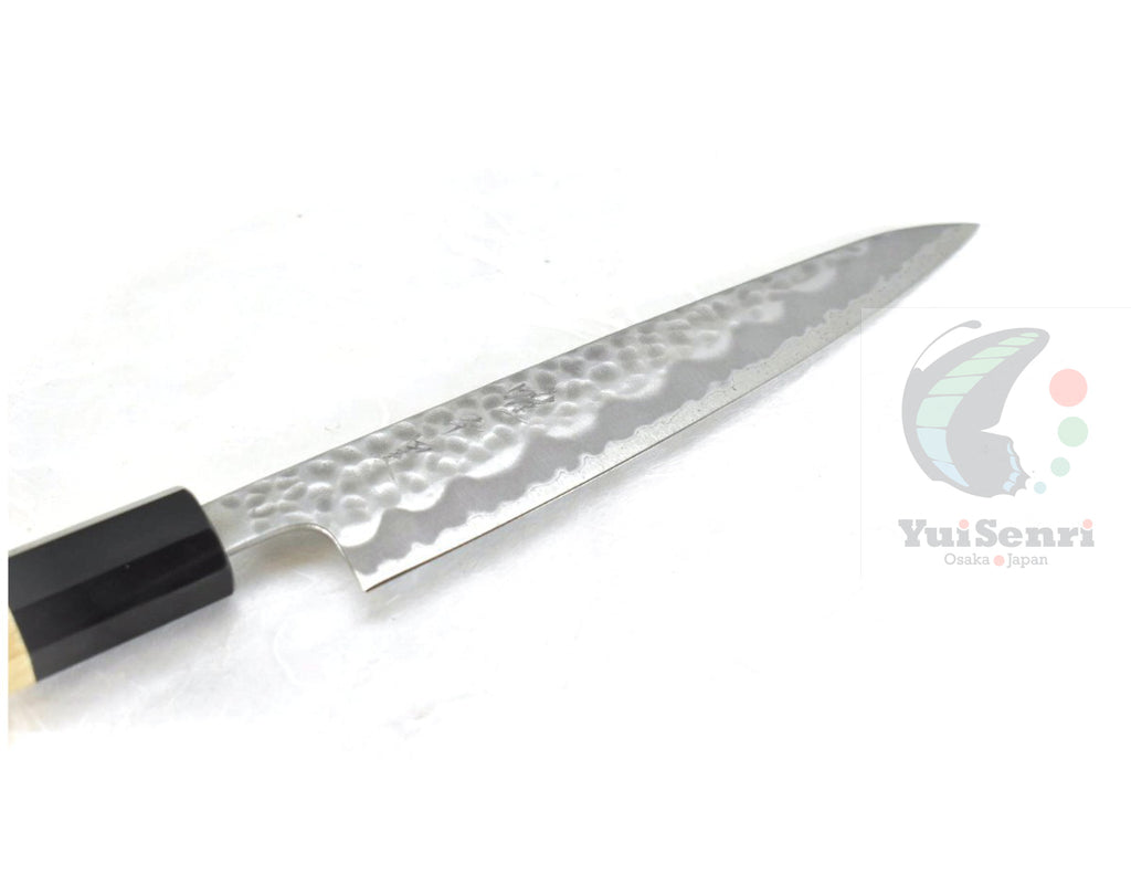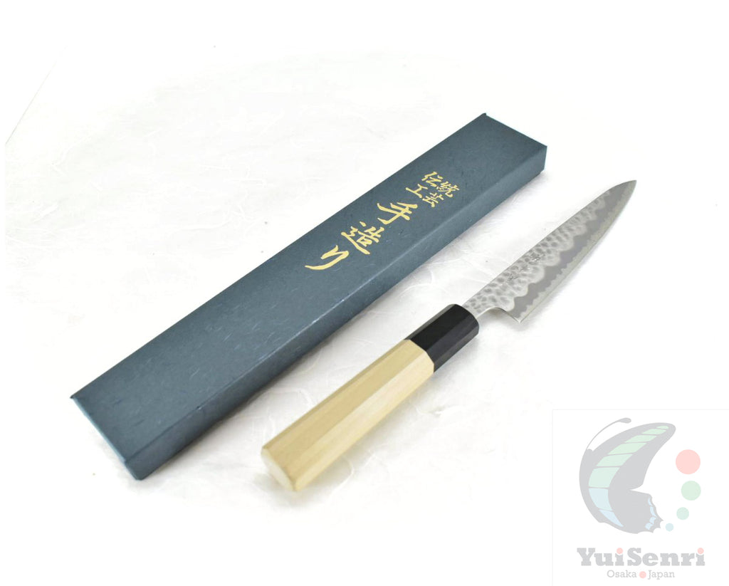 This is a YuiSenri Original Paring Knife, made of Aogami Super at the core of the blade, squeezed into Stainless Steel/ Hammered Finish (known as "Warikomi method"), with Octagonal Walnut Handle.